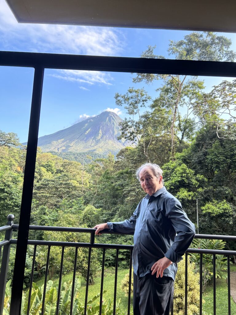 We flew to San Jose, not my favorite place, and stayed one night in town. We tried to walk around and explore a bit but the sidewalks were narrow and busy, and we didn’t feel entirely comfortable. The next morning Juan Carlos picked us up and drove us three hours on spectacular mountain roads to La Fortuna, in the Arenal Volcano area. Our hotel for three nights, Arenal Kioro Spa, was elegant and grand and our room had a fantastic view of the volcano. There was a beautiful winding path through the rain forest to the restaurant, hot springs and pool area. Michael had a bit of trouble with the up-hill parts. Sometimes we walked slowly and sometimes we called for the hotel shuttle to come get us. The breakfast buffet was sumptuous with fantastic coffee, fresh tropical fruits, pastries and sweets and of course beans and rice to go with your eggs. Lunch at the pool café was wonderful as well and I loved having a frozen cocktail in the afternoon while relaxing in the cascading pools of hot springs. I booked a pedicure in the spa, and we even found a ping-pong table and had fun playing on several afternoons. Our activities in La Fortuna included a guided walk through Mistico Park, where we saw birds and snakes and sloths and bounced on hanging bridges, a hike up to the Volcano, and a fun zip line adventure for me, while Michael relaxed by the pool.