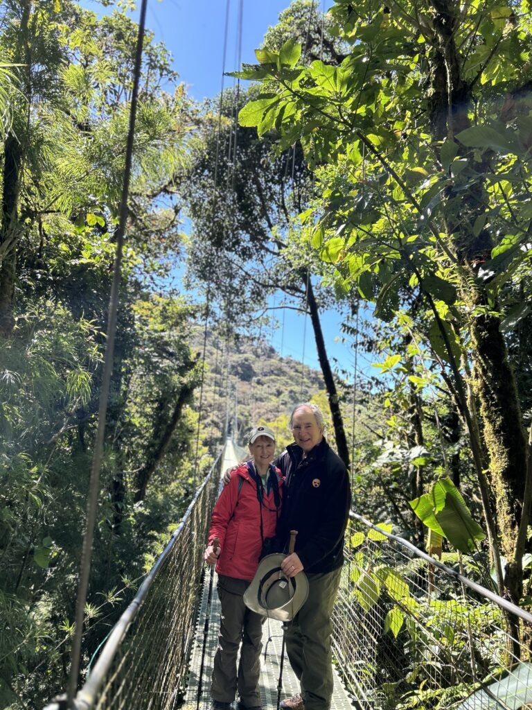 The next destination was Monteverde after another three-hour drive on exhilarating and dizzying mountain roads. Some were paved but some were not, and I was glad I was in a comfortable SUV and not on a bike! Our hotel for two nights , El Establo, was again very grand and spread out over a large and steep mountainside. Michael had trouble with the up-hills, but again there was a hotel shuttle to take us wherever we needed to go. I let him rest in the room while I explored the walk into town. I also took the shuttle to the very top of the property and had a fantastic hike through some jungle trails. They closed at 4pm for the pumas – yikes, luckily, I didn’t see any – but I did walk down the road to the pool area, where Michael came to meet me for a drink. The temperature was cool up here in the mountains, but we were warm sitting in the sun. Our activities included an amazing night walk through a nature preserve. Christian was our wonderful private guide as we carefully made our way through the jungle looking for bugs, snakes, and nocturnal animals. Always the guides would spot something hidden to our eye and locate it in their high-powered scope for us to see. Amazing that they could capture the image in the scope with our phone camera! The next day we met Christian again for a private walk through Treetopia, a large nature preserve with spectacular hanging bridges. We took our time and saw many beautiful birds. It was quite windy, and Christian was disappointed that we only saw 20 species instead of 50!